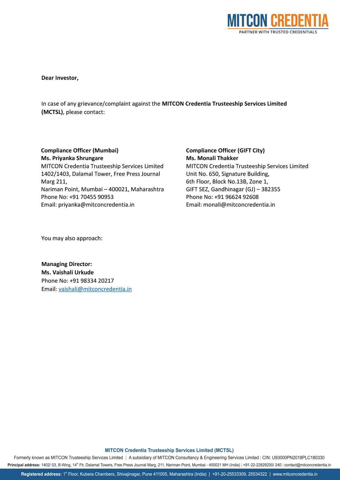 MITCON Credentia Trusteeship Services Limited (MCTSL), a company incorporated under the Companies Act, 2013, is registered with the International Financial Services Centres Authority (IFSCA) and is regulated by IFSCA. MCTSL is acting as Trustee for Alternative Investment Funds in GIFT City, Gujarat International Finance Tec-City (GIFT City), and holds registration number IFSCA/2022-23/AS/00010/0038.